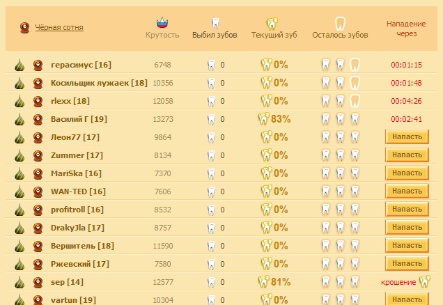 - зуб выбивается, когда его крошение достигает 100%, при этом не обязательно выиграть дуэли;