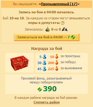 Внимание: при отсутствии соперника, бои формируются из тех команд, которые записаны на бой. Таким образом, в случае отсутствия соперника, бои могут проходить между игроками одной фракции. В такие бои не могут вмешаться депутаты и очки за них не идут в зачет захвата района, но в остальном они точно такие же, как и другие бои, и награда за них идет в полном размере!