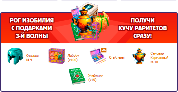 Минирог Изобилия — особый предмет, при открытии которого вы получите один МФ случайного раритета текущей акции из тех, что ещё не собрали максимально! Раритеты у Эйнштейна не учитываются. Если вы получили Минирог, а потом собрали все раритеты, открывая подарки, то из него выпадет Коробка с Лабубой или мёд или Учебник текущей акции.