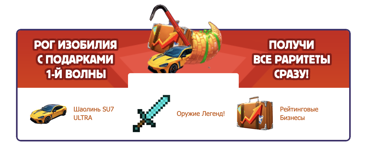 Каждая суперигра стоит 100 и приближает вас к заветному раритету. Накопи 100% и получи Гиперкар, Братские шмотки и Рейтинговые Бизнесы без ожидания возможности открывать подарки! Эти призы будет невозможно выставить на аукцион, не упустите свой шанс получить раритет!