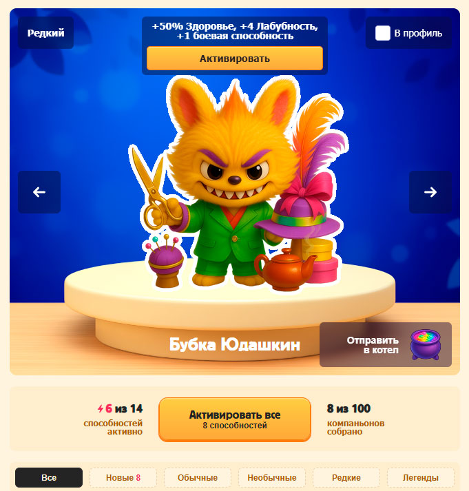 • Привозит из поездки с шансом уникальную способность «Кривое Зеркало»!