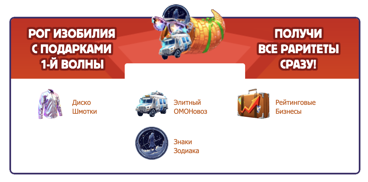Каждая суперигра стоит 100 и приближает вас к заветному раритету. Накопи 100% и получи ОМОНовоз, Диско-шмотки и Рейтинговые Бизнесы без ожидания возможности открывать подарки! Эти призы будет невозможно выставить на аукцион, не упустите свой шанс получить раритет!