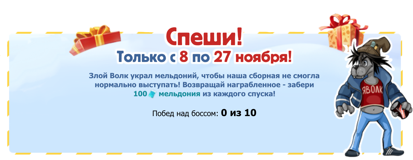 Скоро начнётся праздничная добыча патриотизма, а пока ты можешь собрать мельдония для своих грузовиков! Отправляйся в праздничную подземку, чтобы добывать ценный препарат — по 100 за спуск, всего 10 раз!