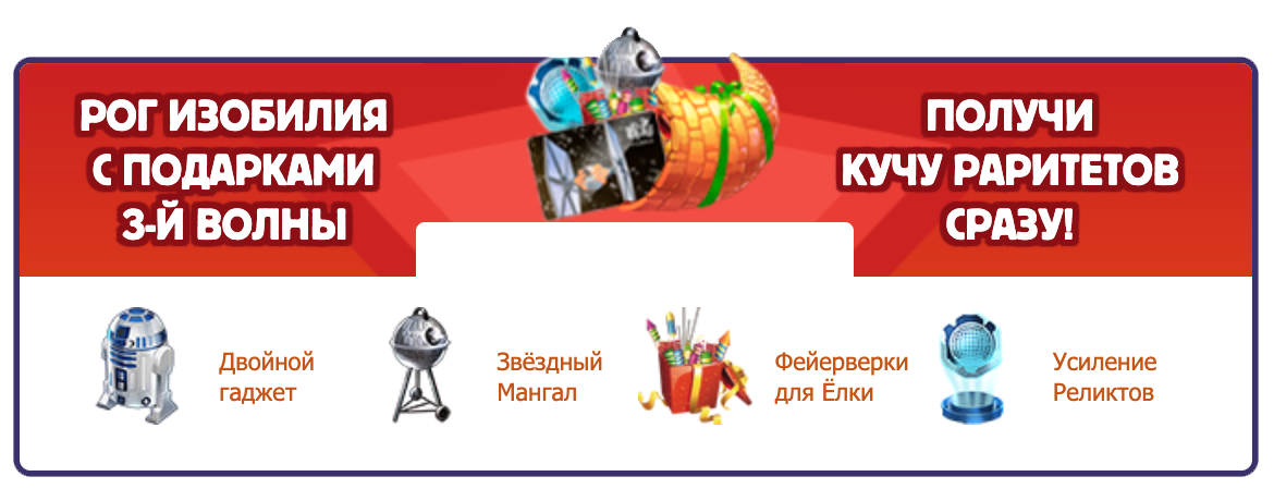 Во всех текущих подарках можно найти рог изобилия с раритетами текущего этапа.