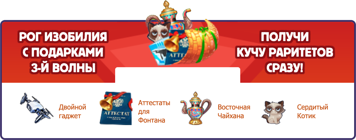 Во всех текущих подарках можно найти рог изобилия с раритетами текущего этапа.