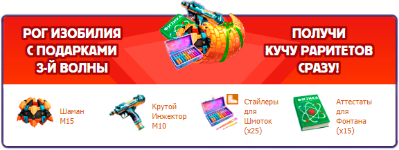 Минирог Изобилия — особый предмет, при открытии которого вы получите один МФ случайного раритета текущей акции из тех, что ещё не собрали максимально! Раритеты из портфелей не учитываются. Если вы получили Минирог, а потом собрали все раритеты, открывая подарки, то из него выпадет Фейерверк для Новогодней Ёлки.