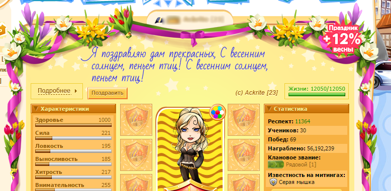 Поздравляем первых счастливчиков, ставших обладателями по-настоящему праздничных профилей! Получившая больше всех цветов девушка и подаривший наибольшее количество подснежников мужчина получают ещё и постоянный бонус +10% ко всем характеристикам!